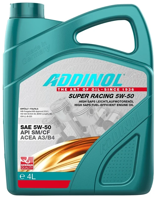 ADDINOL Super Racing 5W-50 ─ унікальна мастило, максимально сберегающая кількість пального. Завдяки продукту легкий хід транспорту забезпечений. Синтетична речовина не поступається за аспектів якості багатьом аналогам, оскільки вміщає стійкі базові різновиди масел, правильно скомбіновані присадки. Його особливості запобігають забрудненню мотора, через що часто виникають збої.
